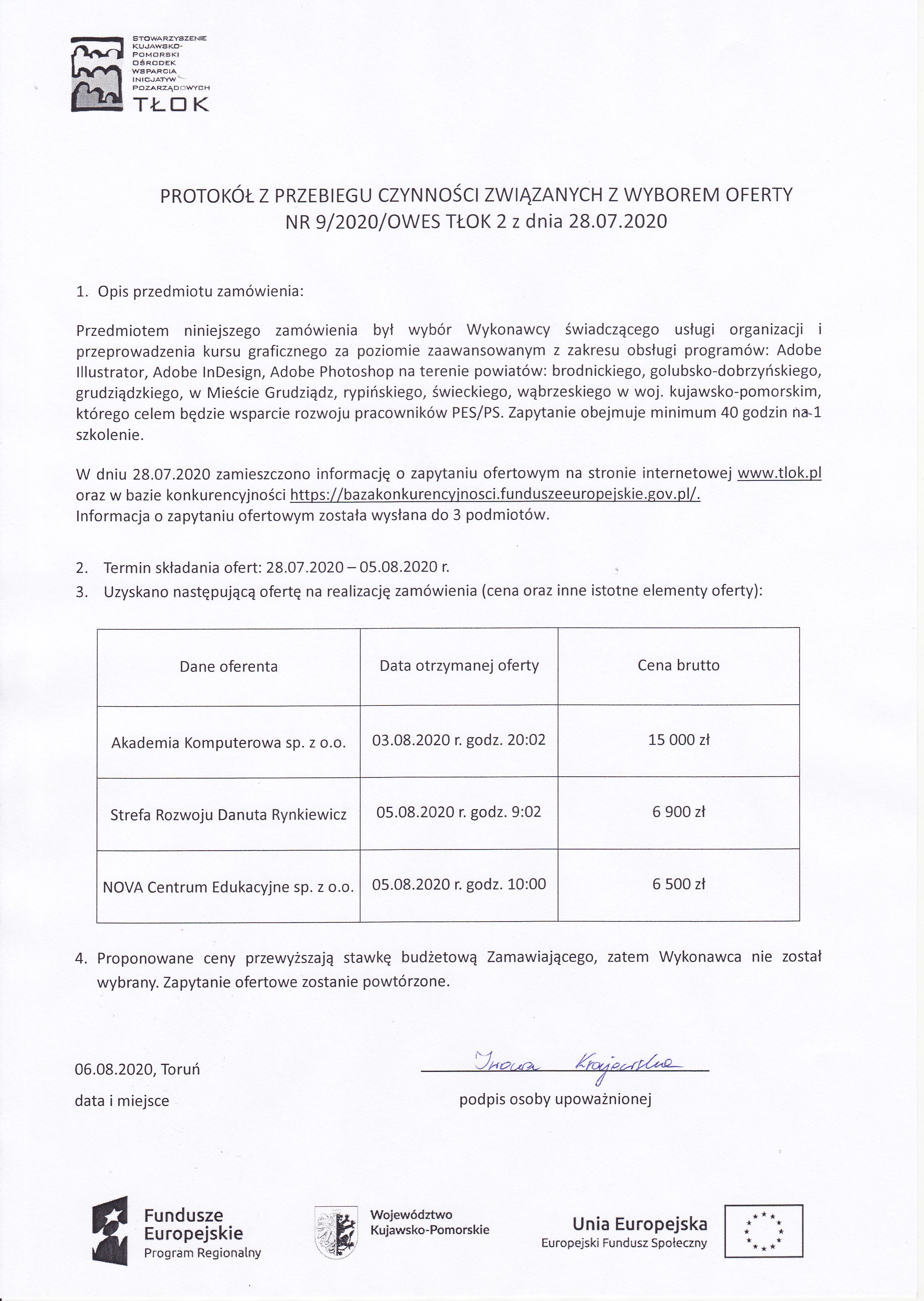Sposób składania ofert: oferty należy przesłać w wersji elektronicznej – skan oferty (preferowane jest przesłanie scanu pełnej oferty w jednym pliku), z podpisem i pieczęcią na adres: zapytania.owes@tlok.pl lub osobiście, pocztą lub kurierem w wersji papierowej na adres: Stowarzyszenie Kujawsko-Pomorski Ośrodek Wsparcia Inicjatyw Pozarządowych TŁOK, Sukiennicza 6/2, 87-100 Toruń z dopiskiem: Zapytanie ofertowe nr 9/2020/OWES TŁOK 2 z dnia 28.07.2020 r.; (liczy się data wpływu ofert do Zamawiającego).